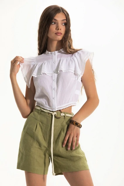 Шорты с отрезным поясом, застежка-гульфик, пояс застегивается на одну пуговицу. Передние половинки с карманами. Вход в карман наклонный к боковому шву. Пояс со шлевками. Задние половинки с отрезной кокеткой. Передние половинки с отрезной кокеткой и односторонними складками по шву притачивания кокетки.