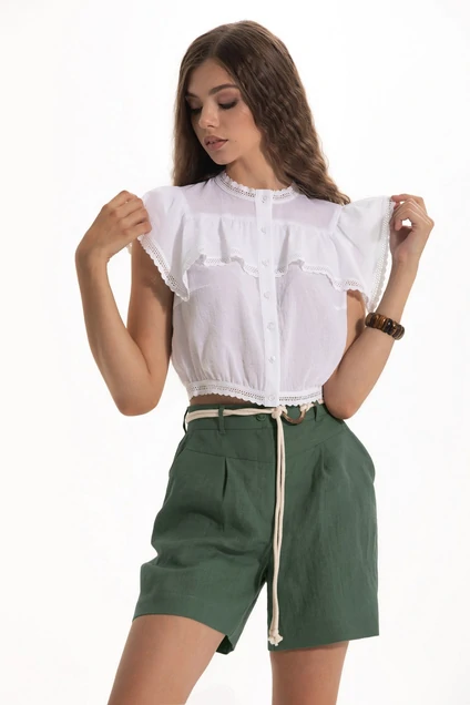 Шорты с отрезным поясом, застежка-гульфик, пояс застегивается на одну пуговицу. Передние половинки с карманами. Вход в карман наклонный к боковому шву. Пояс со шлевками. Задние половинки с отрезной кокеткой. Передние половинки с отрезной кокеткой и односторонними складками по шву притачивания кокетки.
