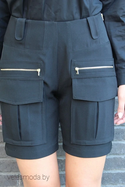 Шорты женские, повседневные, прямого силуэта. Передние половинки шорт с резаными кокетками на которые настрочены фигурные шлевки, с накладными карманами с клапаном, выше которых настрочена планка с декоративной молнией. Задние половинки шорт с резаными кокетками на которые настрочены фигурные шлевки, и карманами с листочкой. По кокеткам, карманам, клапанам проложена отделочная строчка. Верх брюк обработан обтачкой