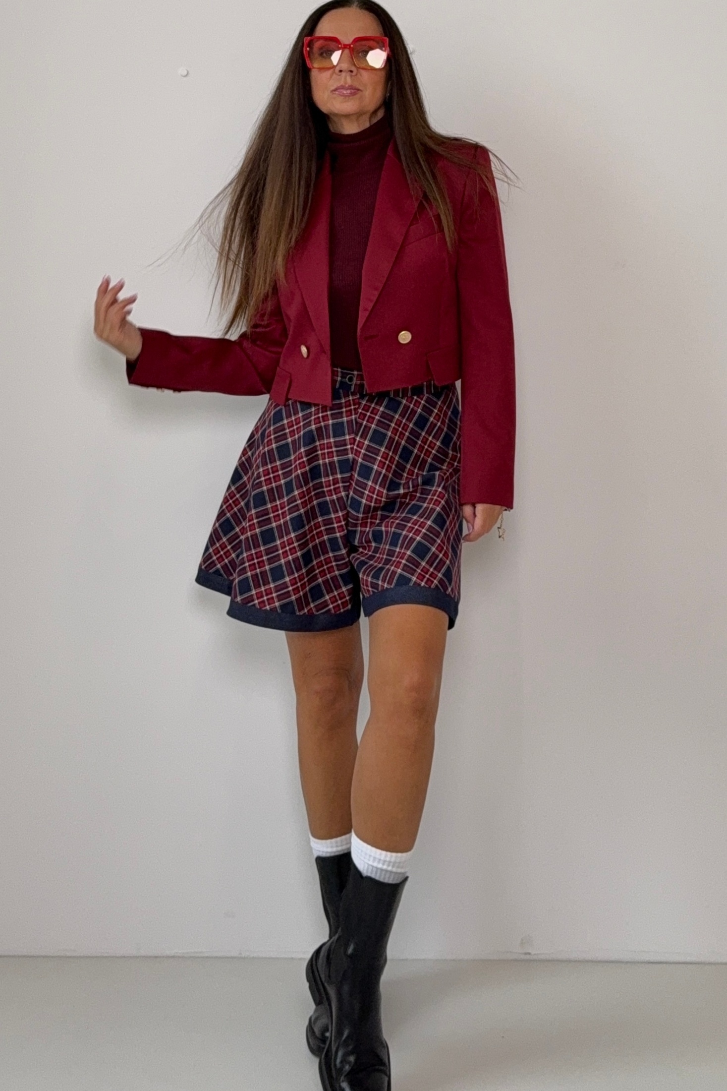Расклешённые женские шорты из плотной ткани c актуальным клетчатым принтом. Модель выполнена в насыщенных оттенках бордового и тёмно-синего, украшена отделочными деталями по низу изделия. Верхний край оформлен притачным поясом и застёжкой на тесьму-"молнию", что обеспечивает комфортную посадку и современный акцент. Шорты станут стильным элементом для создания выразительных образов.