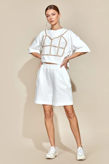 Шорты женские из хлопкосодержащего трикотажного полотна. По переду застрочены складки, обработаны карманы с наклонным входом. Пояс шорт отстрочен с резинкой.