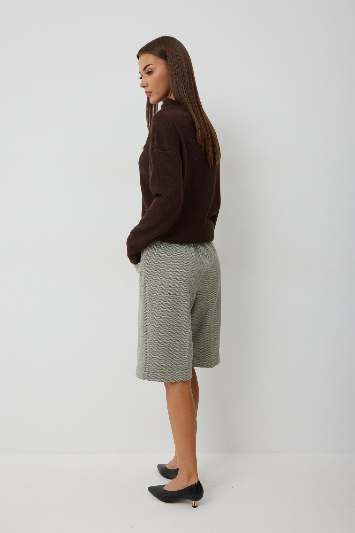 Бермуды женские прямые длиной до колена. На передних половинках обработаны карманы с отрезным фигурным бочком. На передних и задних половинках заутюжены стрелки. На задних половинках обработаны вытачки. Застёжка-молния распологается на передних половинках бермуд, обработана в гульфике. Верхний срез обработан отрезным поясом, по спинке брюк в пояс вставлена резинка. Пояс застегивается с помощью отрезной детали на декоративные пуговицы.