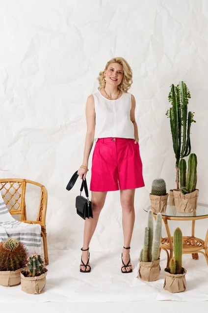 Льняные шорты для городского лета - тренд этого сезона. Посадка высокая, что визуально удлинит ваши ноги. По переду складка, карман с наклонным входом. Шорты такой конструкции подчеркнут элегантность и изящность вашего образа. Они великолепно сочетаются с офисным и городским стилем.