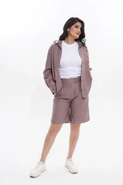 Шорты женские, прямые, с отрезным поясом, застегивающимся на две петли и две пуговицы, и застежкой - гульфиком на молнии. Передняя часть с застроченной складкой, идущей от талии и с карманом в шве с наклонным входом. Задняя часть с отрезной кокеткой и накладными карманами фигурной формы. Пояс с резинкой по спинке. Длина изделия - 58 см.