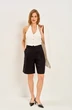 Шорты женские свободного кроя, расширенные к низу. На передних половинках брюк обработаны боковые карманы в швах.Застежка на тесьму молния с потайной пуговицей и брючным крючком. Пояс брюк обрабатывается корсажной тесьмой. По поясу настрочены шлевки для ремня. По передней половинке заложены две складки, одна из которых переходит в застроченный кант . Задние половинки с вытачками и заутюжеными кантами.