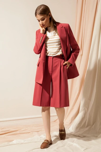 Стильные бермуды из костюмной ткани расклешенные от бедра, на поясе с небольшими складками по переду и боковыми наклонными карманами. Сзади имитация карманов с листочками. Акцентом на брюках служат металлические золотые пуговицы.