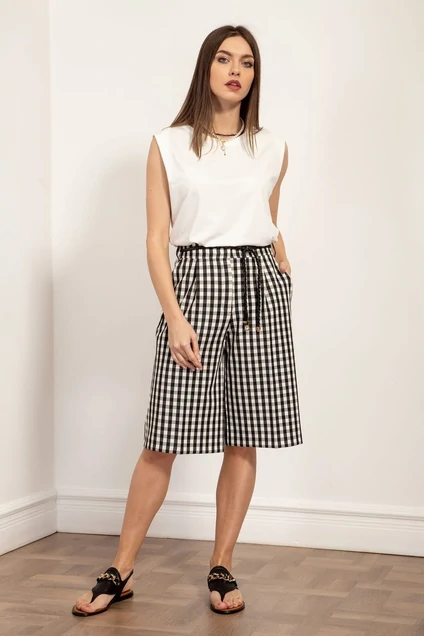 Стильные бермуды из костюмной ткани в клетку, расклешенные от бедра, на поясе с небольшими складками по переду и боковыми наклонными карманами. Сзади имитация карманов с листочками.