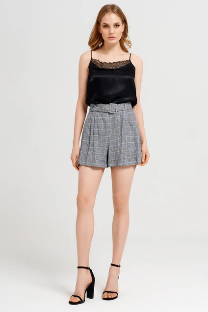 Стильные и удобные шорты из натурального льняного полотна с вискозой с рисунком в клетку. Шорты на отрезном поясе на талии, с ремнём из основной ткани, застёгивающимся на пряжку с язычком и блочками. По спинке в поясе оформлена резинка. Застёжка спереди на молнию с гульфиком и петлю-пуговицу на поясе. По бокам выполнены карманы.Также спереди выполнены защипы от верхнего среза. По низу шорт имитация отложных манжет. Прекрасный вариант одежды, чтобы выглядеть стильно и привлекательно каждый летний день, как в офисе, так и на встречи с друзьями.