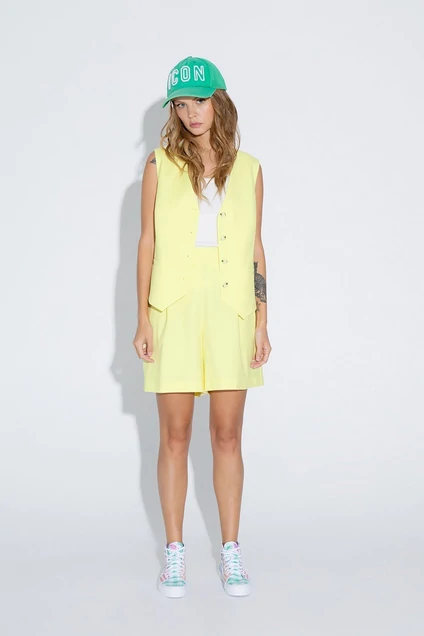 Текстильные шорты с завышенной линией талии. Детали: высокая посадка, складки по переду, вытачки, застежка на потайную молнию сзади, боковые карманы