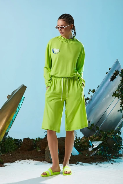 Шорты свободного силуэта, слегка расширенного к низу, длиной ниже линии колена. Передние части с боковыми карманами «листочка», а задняя правая с накладным, пояс на эластичной тесьме. Такие универсальные и практичные они обязательно станут неотъемлемой частью Вашего гардероба.
