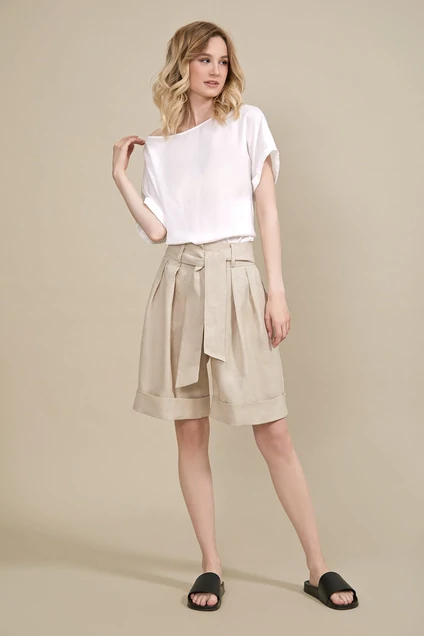 Льняные шорты с завышенной талией. Свободный крой, на поясе складки, по низу изделия манжеты. По бокам карманы. В комплект входит пояс из основной ткани.
