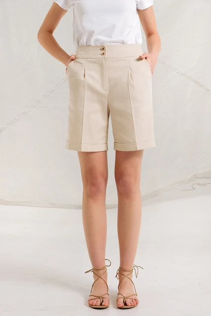 Шорты прямого силуэта с завышенной талией. Застежка на пуговицах и брючной молнии. В боковым швах карманы. На передних половинка шорт односторонние складки. По низу шорт подворот. Длина изделия — 45 см.