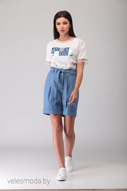 Шорты прямого силуэта, длиной 43,5см по боковому шву от пояса.Верхний срез шорт на притачном поясе, шириной 6,0см. Пояс с эластичной тесьмой, которая настрачивается по участкам, и шлевками. Через шлевки продевается съемный пояс. Пояс застегивается на 2 пуговицы.На передних половинках шорт накладные карманы прямоугольной формы с декоративными складками.На задних половинках шорт вытачки, а на левой задней половинке имитация кармана с листочкой.Низ шорт с отворотами, шириной 4,0см