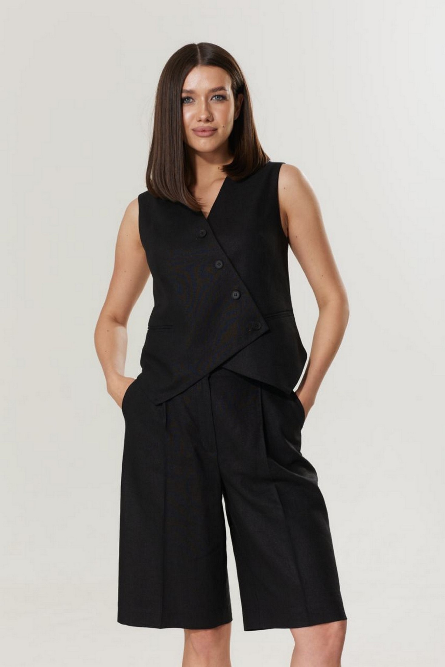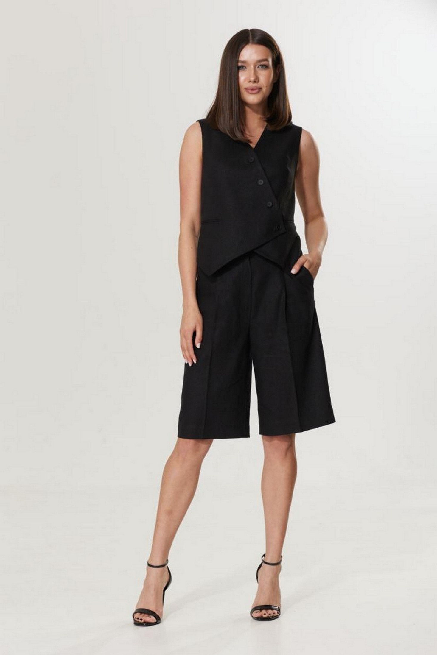 Шорты прямого силуэта, длиной до колена. Пояс притачной с застежкой на петлю и пуговицу. Застежка на молнию в гульфике. В боковых подрезах по переду функциональные карманы.