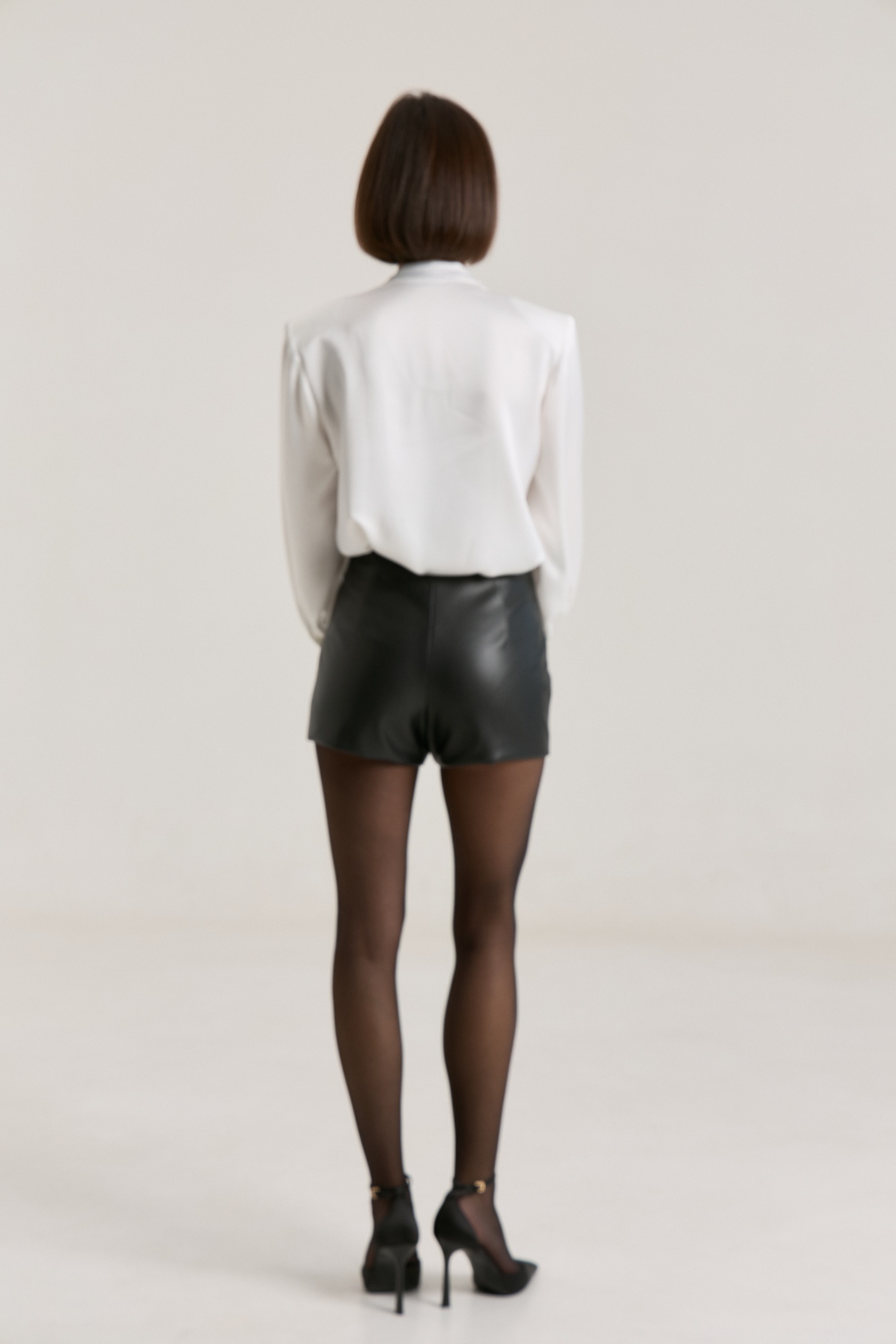 Шорты прилегащего силуэта, на подкладке, в боковом шве молния. Шорты выполнены из мягкой экокожи черного цвета.Шорты красвио сочетаются со свитерами, футболками, лонгами, летом можноносить с топами и босоножками. Можно носить в комплекте с нашим жакетом арт. 2463 из экокожи. По боковому шву 36 см , полуобхват талии в 42-м размере 33 см.Рост модели 168 см.