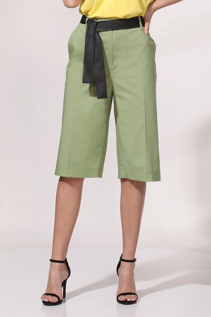 Длинные шорты из костюмной ткани классического кроя. На притачном поясе со шлевками для ремня, с застежкой на пуговицу и молнию, с карманами сзади и боковыми наклонными карманами спереди. Длина - 67 см. Пояс в комплект не входит.
