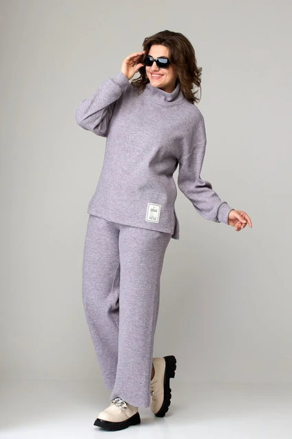 Костюм женский , состоящий из джемпера и брюк. Джемпер прямой с воротником "стойка" и фигурной линией низа , перед с декоративной нашивкой , рукава рубашечного покроя с притачными трикотажными манжетами по низу, внизу боковых швов разрезы . Брюки из трикотажного полотна прямые широкие, с карманами у боковых швов на притачном поясе с резинкой .измерения в готовом виде