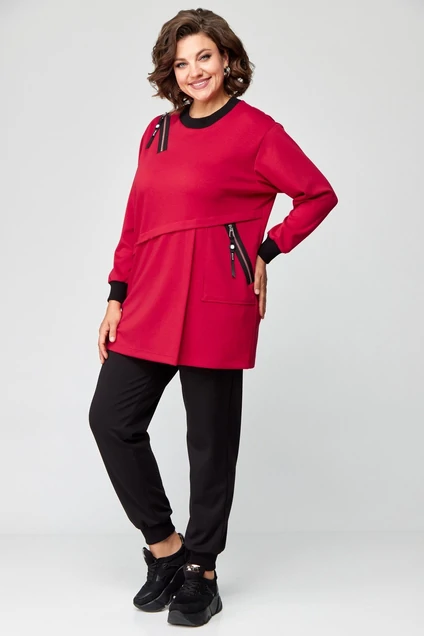 Костюм состоящий из джемпера и брюк выполнен из однотонного трикотажного полотна в двух контрастных цветах.