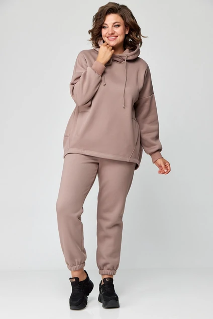 Костюм женский, состоящий из худи и брюк, выполнен из трикотажного полотна с изнаночной стороны на флисе. Худи свободного, обьемного силуэта. Полочка худи с подрезами, горловиной круглой формы с капюшоном. Верхняя часть спинки цельная, с переходящими боковыми швами на полочку. Нижняя часть спинки притачная, изогнутой формы, за счет чего образуется обьем. Рукав одношовный, длинный, на притачной манжете по низу.