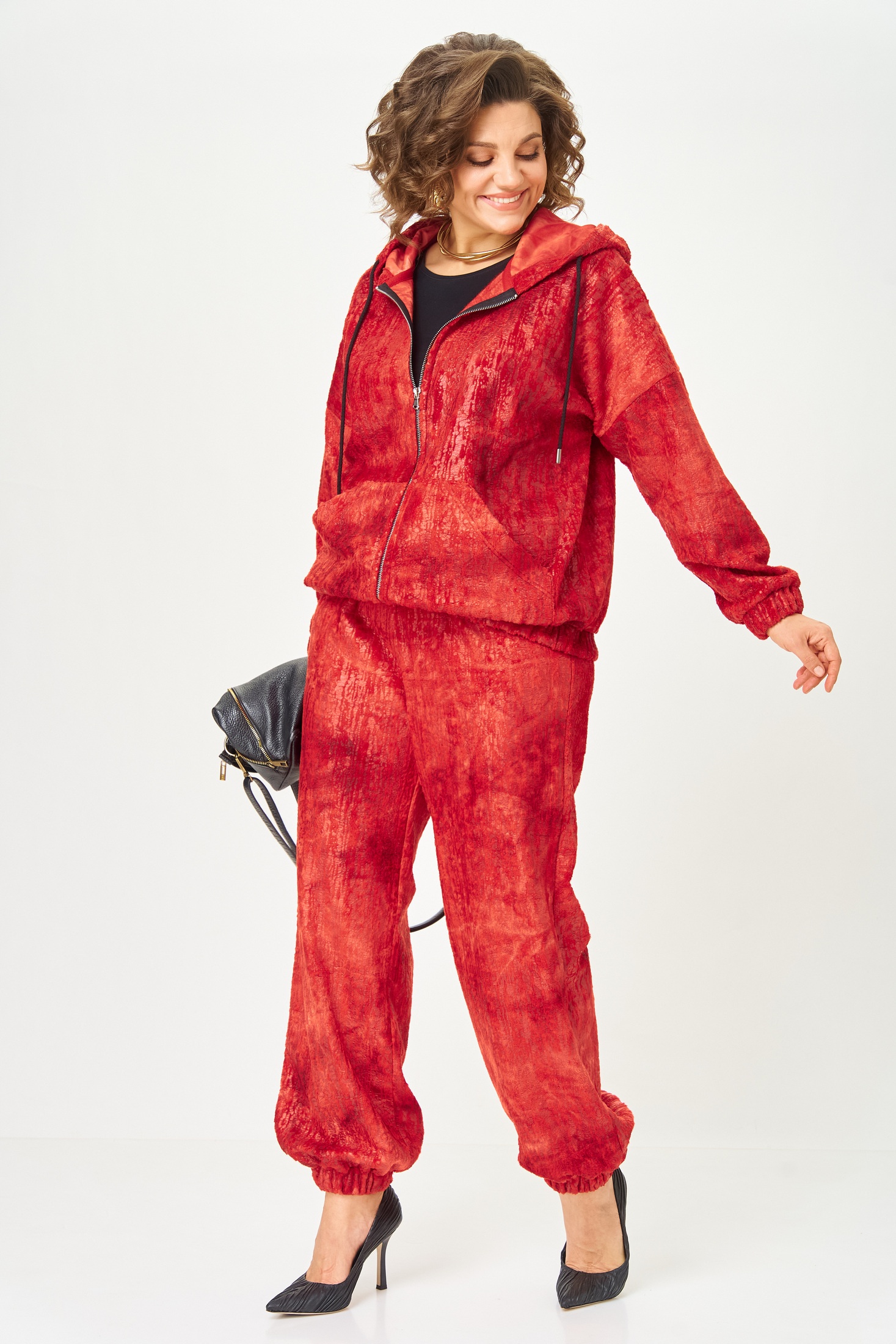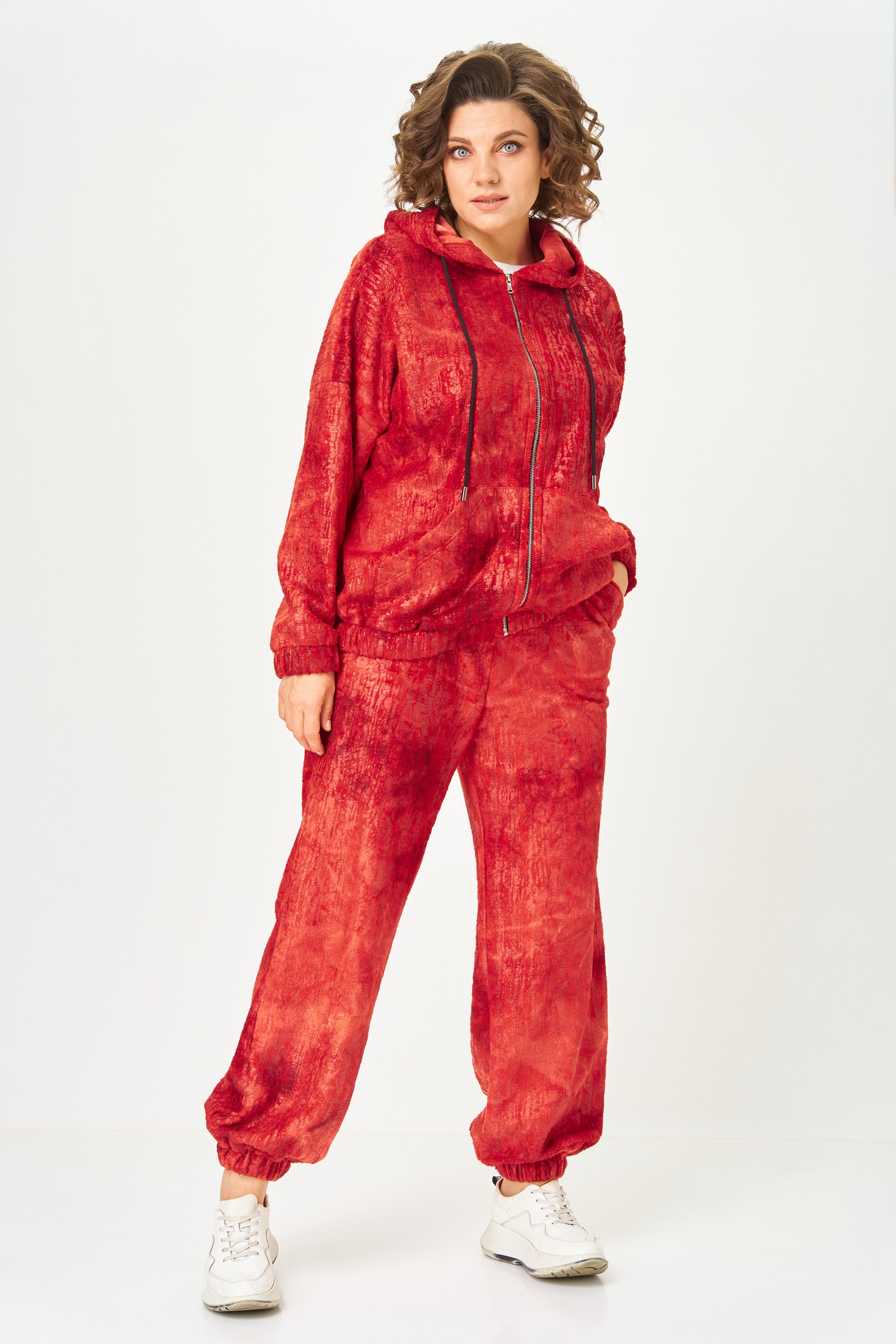 Костюм состоящий из худи и брюк выполнен из плюша на трикотажной основе. Плюш с эффектом напыления.