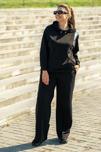 Косюм женский спортивный современный с стиле спорт-шик, джемпер со вставками " под змею серебро". Джемпер с с большим капюшоном с протяжками и металлическими наконечниками, с прорезными карманами с листочками, с втачными рукавами с притачными манжетами, по низу джемпера сс протяжками и металлическими наконечниками. джемпер со вставкой с молнией по полочке и переходящяя на спинку. Брюки на поясе с резинкой , в швах боковые карманы, передние половинками с защипами.