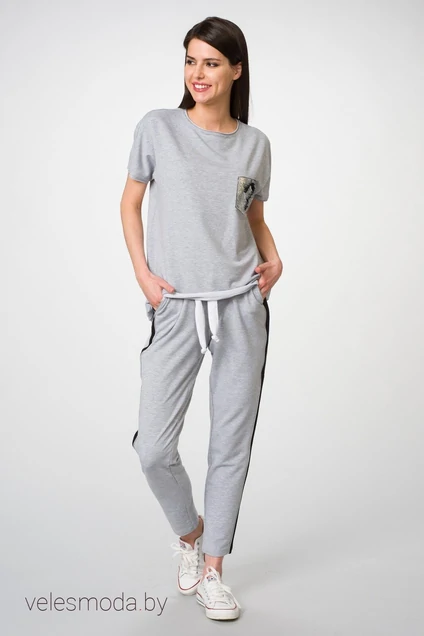 Костюм спортивный прямого силуэта; резинка; карманы в шве; накладной карман; вырез горловины - округлый; рукава короткие; длина блузы - 68 см, длина брюк - 94 см; без рисунка; пайетки; уход за изделием - ручная стирка, отжим запрещен, гладить не более 110С, деликатная химическая чистка, сушка в вертикальном положении