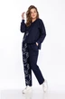 Костюм спортивный свободного силуэта.Джемпер с декоративной печатью, полочка состоит из двух частей.Рукав спущенный,низ рукава и горловина обработаны трикотажным довязом,спинка длиннее переда.Длина джемпера 68 см. Брюки с боковыми карманами в швах, пояс на резинке. Длина брюк 102 см.