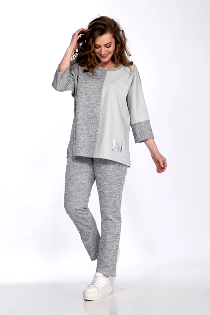 Джемпер женский прямого силуэта,с разрезами в боковых швах,полочка из двух тканей разного состава и цвета.Рукав цельнокройный с приточным монжетом.Длинна изделия 66 см. Брюки с боковыми карманами в швах,пояс на резинке.Длина брюк 102 см.