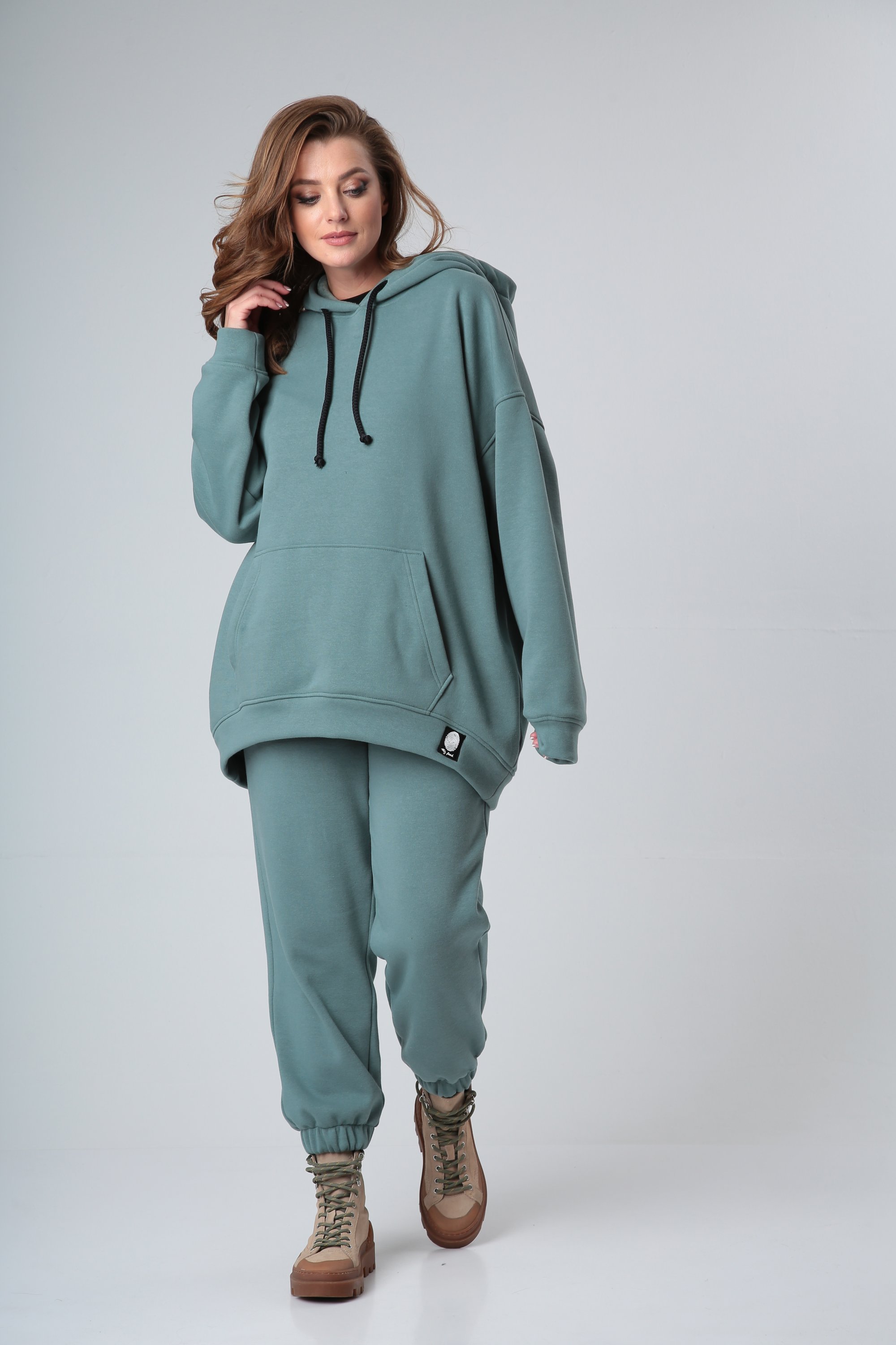 Комплект утеплённый из худи и спортивных брюк. Худи со спущенной линией плеча, свободного силуэта. С двойным капюшоном, по переду карман по типу “кенгуру”. Длина по переду от плеча 79 см. Длина рукава от горловины 80 см. В брюках по талии резинка и шнурок, имеются карманы в швах. Низ брюк оформлен резинкой. Длина брюк по боковому шву 101 см. По внутреннему 75 см.