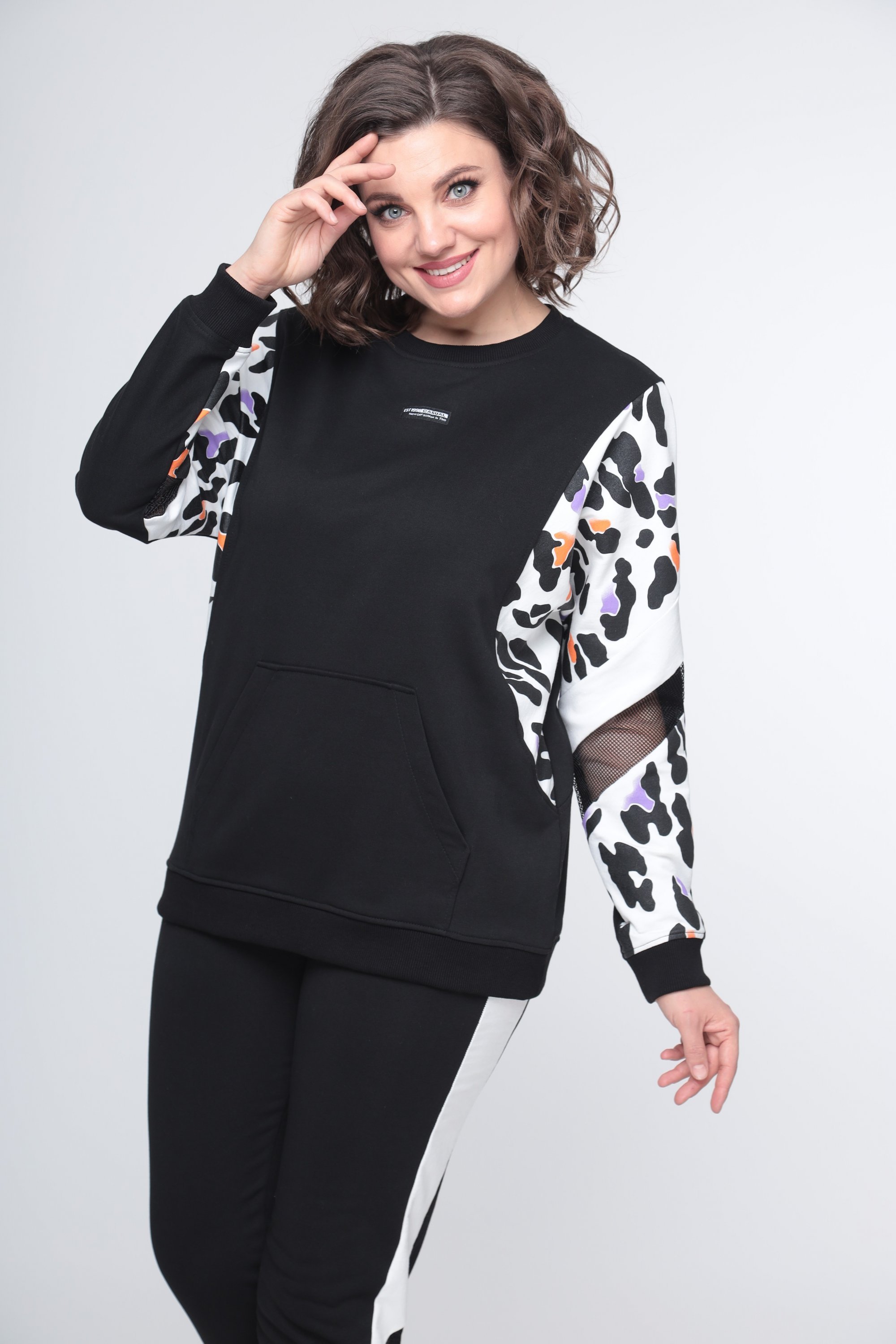 Свитшот свободного силуэта, с боковыми вставками из футера с принтом. По переду в нижней части накладной карман «кенгуру», горловина круглая, рукава на основе цельновыкроенного со вставками из сетки и однотона. Низ свитшота и рукава оформлен довязом.