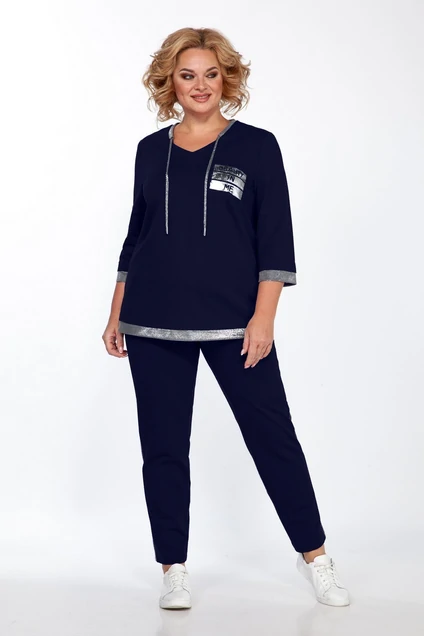 Стильный женский костюм, состоит из блузона и брюк. Костюм выполнен в спортивном стиле. Блузон свободного силуэта по переду печать. Горловина «V» образная с отделочной планкой, в которую продета декоративная цепочка, низ блузона и рукава планки выполнены из отделочной ткани. Рукава втачные ¾. Брюки с боковыми карманами, по боковому шву - лампасы из отделочной ткани. Верх брюк обработан поясом на резинке.