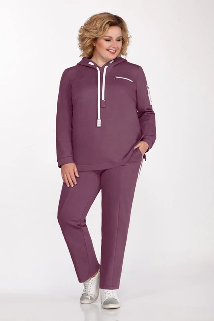 Стильный женский костюм выполнен в спортивном стиле из трикотажного полотна, состоит из блузона и брюк. Блузон полуприлегающего силуэта. По переду отрезная кокетка, горизонтальный подрез, в шве которого обработана декоративная молния в «рамку». Спинка с отрезной кокеткой, со средним швом. По боковым швам блузона разрезы, оформлены отделочными строчками. Рукава втачные, одношовные, по низу притачной манжет из основной ткани. На левом рукаве накладной карман с декоративной молнией и пришивной нашивкой. Горловина блузона оформлена капюшоном с декоративным шнуром и пришивной нашивкой.