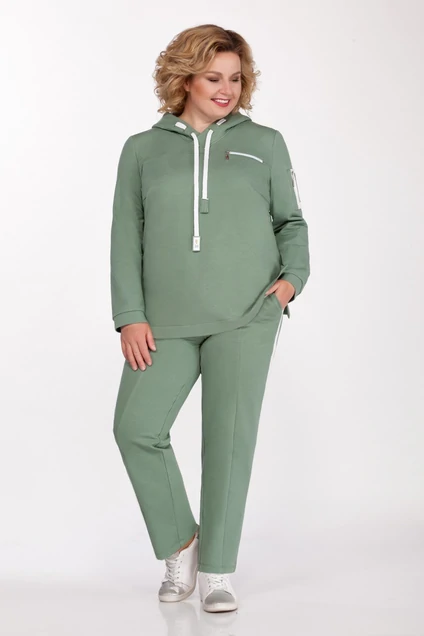 Стильный женский костюм выполнен в спортивном стиле из трикотажного полотна, состоит из блузона и брюк. Блузон полуприлегающего силуэта. По переду отрезная кокетка, горизонтальный подрез, в шве которого обработана декоративная молния в «рамку». Спинка с отрезной кокеткой, со средним швом. По боковым швам блузона разрезы, оформлены отделочными строчками. Рукава втачные, одношовные, по низу притачной манжет из основной ткани. На левом рукаве накладной карман с декоративной молнией и пришивной нашивкой. Горловина блузона оформлена капюшоном с декоративным шнуром и пришивной нашивкой.