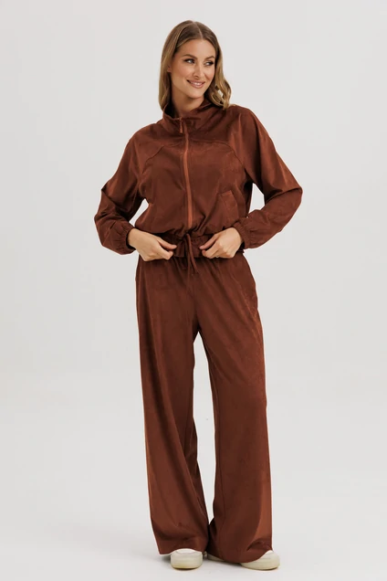 Костюм женский, состоящий из ветровки и брюк. Костюм выполнен из искусственной замши. Ветровка с центральной застежкой на тесьму-молнию, с притачной по низу планкой, с кулисой. По переду обработаны карманы с листочкой. Рукава - реглан, с нижним швом и вытачкой, с резинкой по низу. Воротник -стойка. Брюки с притачным поясом с резинкой. По поясу проложены 2 параллельных строчки. На передних половинках брюк обработаны боковые карманы