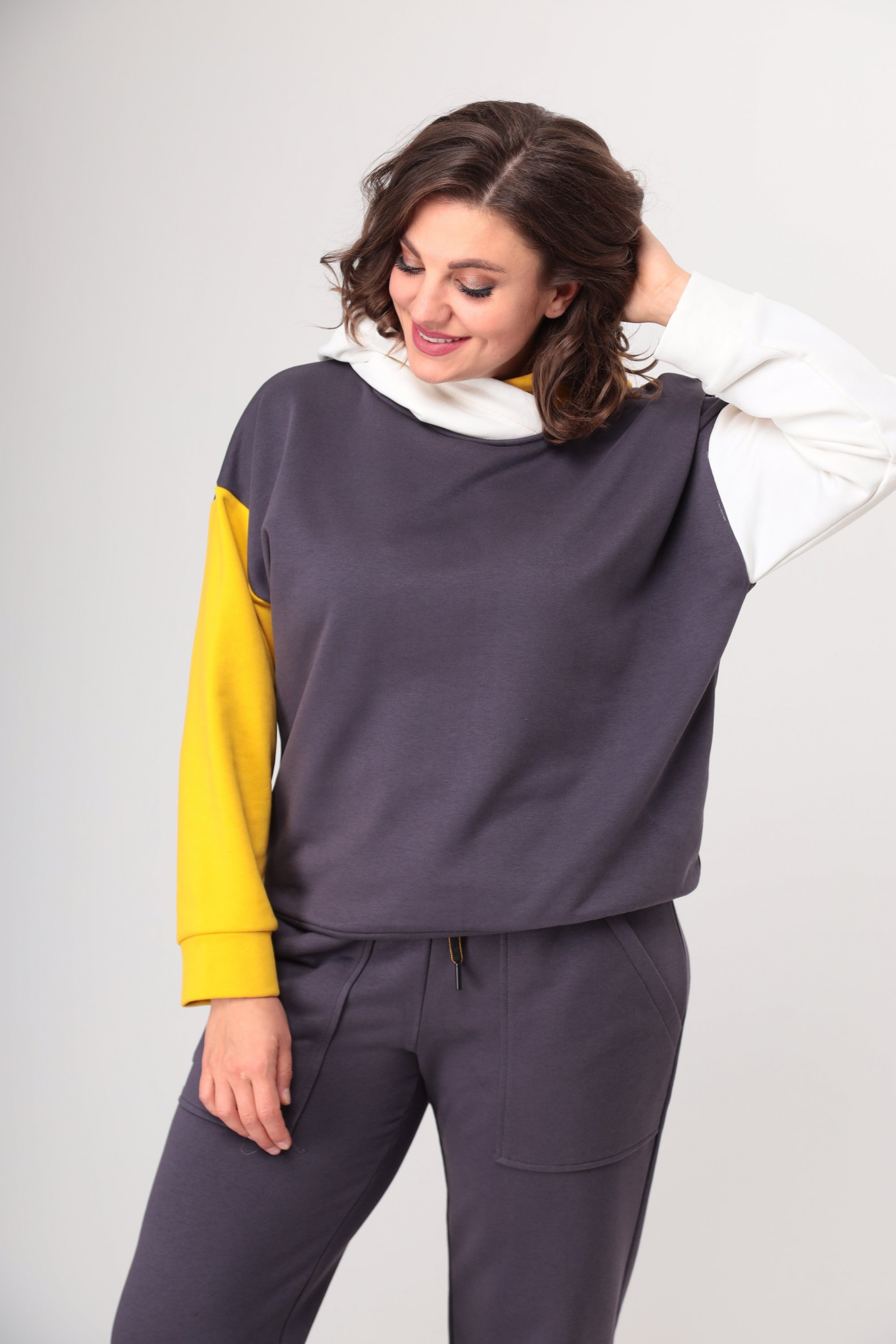 Спортивный костюм в стиле «спорт-шик» из качественного трикотажного полотна футер 2-х предметный: худи и брюки-джогеры. Смелое сочетание разных цветов ткани, свободный и комфортный стиль, делают модель выразительной и стильной. Худи прямого свободного покроя с эффектным капюшоном, со спущенной линией плеча, по низу изделия широкий притачной пояс. Рукава втачные, длинные с притачными манжетами, на левом рукаве декоративный шеврон. Брюки-джогеры свободного прямого