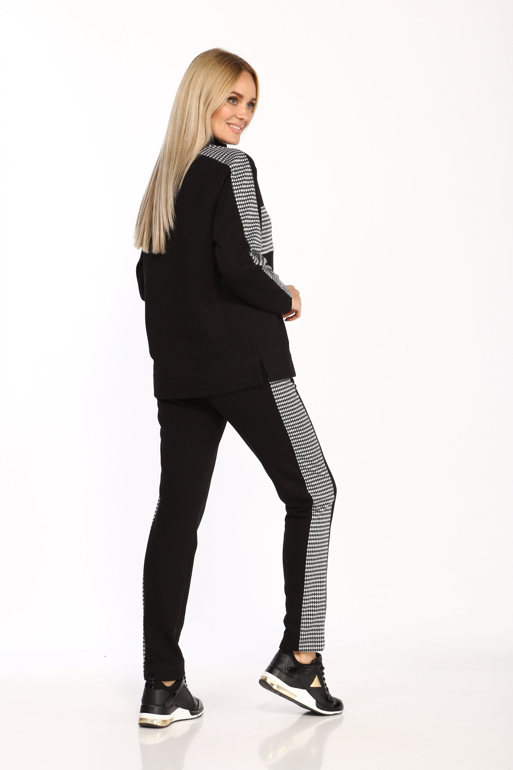 Стильный костюм весьма актуален и функционален в современном ритме жизни. Предлагаем джемпер и брюки из трикотажного полотна футер с отделочными элементами ткани-компаньона. Джемпер свободного прямого силуэта, линия плеча приспущена, рукава втачные, длинные, с центральной деталью из отделочной ткани, которая переходит на линию плеча. Горловина округлая с втачной мягкой стойкой, по переду лифа центральная застежка на декоративную молнию до уровня груди и декоративная деталь из отделочной ткани. Спинка цельная. По низу изделия широкая подгибка с небольшими разрезами по боковым швам. С левой стороны пришивной декоративный шеврон. Брюки прямые, чуть заужены к низу, с карманами в боковом шве. Вдоль бокового шва широкий лампас из отделочной ткани. Пояс притачной с эластичной тесьмой-резинкой и декоративным шнурком. Универсальный костюм для повседневной носки, очень комфортный и уютный.