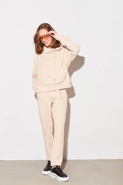 Комплект, в спортивном стиле, состоящий из джемпера и брюк, изготовлен из трикотажного полотна средней плотности в сочетании с матовым атласом.