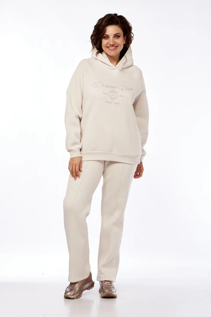 Комплект брючный( кофта+брюки). Кофта прямого силуэта с притачным манжетом из отделочной ткани. Рукав покроя реглан с притачным манжетом по низу. Капюшон. В качестве отделки используется вышивка на центральной части переда. Брюки прямые. Верхний срез обработан поясом с резинкой. В боковых швах обработаны карманы. На передних половинках застрочены стрелки. Длина кофты по спинке 68 см, длина рукава+ширина плеча 76 см. Длина брюк 109 см