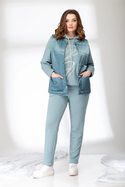 Спортивный женский комплект тройка состоит из жилета, джемпера и брюк. Жилет стеганный на синтепоне, из плащевки. По переду на кнопках, карманы накладные над ними отделочная складка. Жилет на подкладке. Джемпер свободного силуэта, по низу на манжете. С капюшоном. По переду дизайнерский принт. На капюшоне люверсы и шнурок с металлическим наконечником. Рукав длинный на манжете. Брюки прямые, на поясе, сзади на резинке, посадка средняя - 3 см ниже уровня линии талии. По бокам функциональные карманы. Длина жилета по спинке - 63 см . Длина джемпера по спинке - 64 см. Длина рукава джемпера - 60 см. Длина брюк - 103 см.
