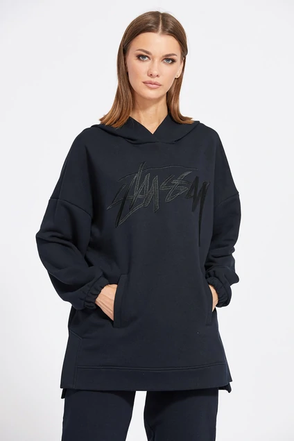 Комплект: джемпер + брюки. Комплект выполнен из однотонного трикотажного полотна. Джемпер прямого силуэта, покроя оверсайз, длиной ниже линии бедер. Перед и спинка цельные. Плечевой шов спущен. Горловина округлой формы, обработана капюшоном. Спереди карманы с листочками. Рукав одношовный. Низ рукава и джемпера на манжете. В боковых швах джемпера шлицы. Спинка длиннее переда. Джемпер декорирован вышивкой по переду. Брюки на притачном поясе с эластичной тесьмой, заужены к низу. Низ брюк на манжете.