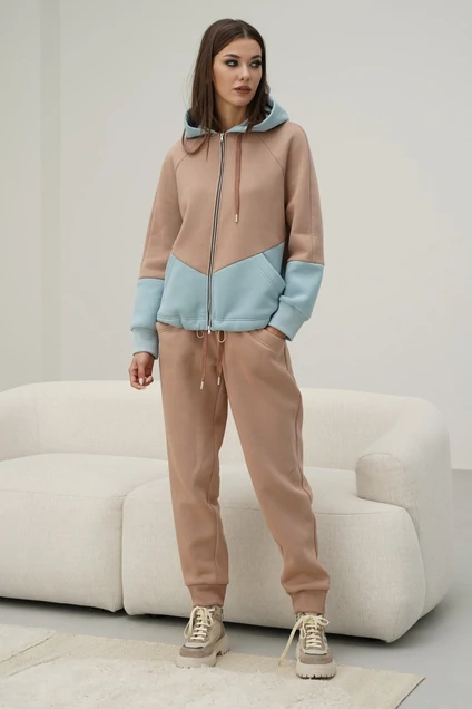 Сегодня мода не диктует чёткого разграничения спортивного и классического гардероба. Совсем наоборот – стилисты предлагают удачно смешивать стили, раздвигая рамки дозволенного. Так спортивный костюм перекочевал в рейтинг повседневных нарядов и занял лидирующие позиции. Мягкий и комфортный х/б футер с начёсом внутри, свободный покрой реглан, капюшон с люверсами и отделочным шнуром, центральная застежка на тесьму-молнию. Полочка с фигурным подрезом из отделочной ткани в технике колор-блок и наклонным карманом. Рукав с отделочной нижней частью и манжетой. Капюшон из отделочной ткани. По низу регулируемая кулиса. Брюки-джоггеры на эластичном поясе с люверсами и отделочным шнуром и мягкими отрезными манжетами по низу. На передних половинках наклонный карман.