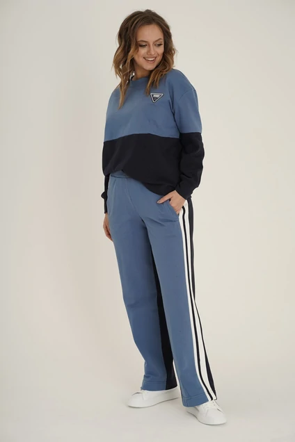 Этот яркий костюм специально предназначен для активных и целеустремленных, тех, кто всегда в движении. Он практичен, удобен, а благодаря использованной технике соединения цветов «колор блок» - максимально подходит тем, кто стремится к самовыражению через детали. Свитшот свободный, оверсайз с заниженной линией плеча и рубашечным рукавом на манжете. Брюки свободного, слегка расширенного к низу покроя, на эластичном поясе, с боковыми карманами и листочкой, отделочными боковыми лампасами.