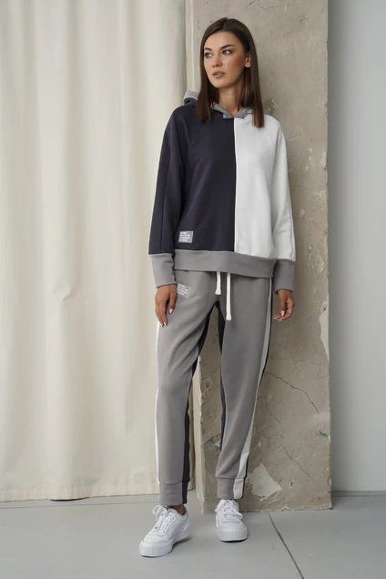 Перед тем, как отправиться на прогулку, шоппинг или активный вид отдыха, каждая из нас задумывается об одежде, которая будет практичной и одновременно стильной. Мы создали для вас спортивную капсулу, включающую несколько моделей худи и брюк, обьединенных общим стилистическим решением. Это позволяет составить комплект, который подходит именно вам, в котором вы точно почуствуете себя уверенно и комфортно (модель с широкими брюками арт.4340). Худи колор-блок из хлопчатобумажного футера. Покрой - реглан, силуэт прямой свободный. Полочка с центральным швом и боковым карманом с листочкой. Капюшон со средним швом. По низу рукавов притачная манжета, по низу изделия - пояс. Комфортные брюки джоггеры выполненные также в технике колор-блок. Высокая посадка, боковой карман с листочкой, комфортный эластичный пояс с люверсами и отделочным шнуром. По низкам брюк - отрезной манжет. Длина брюк около 98 см.