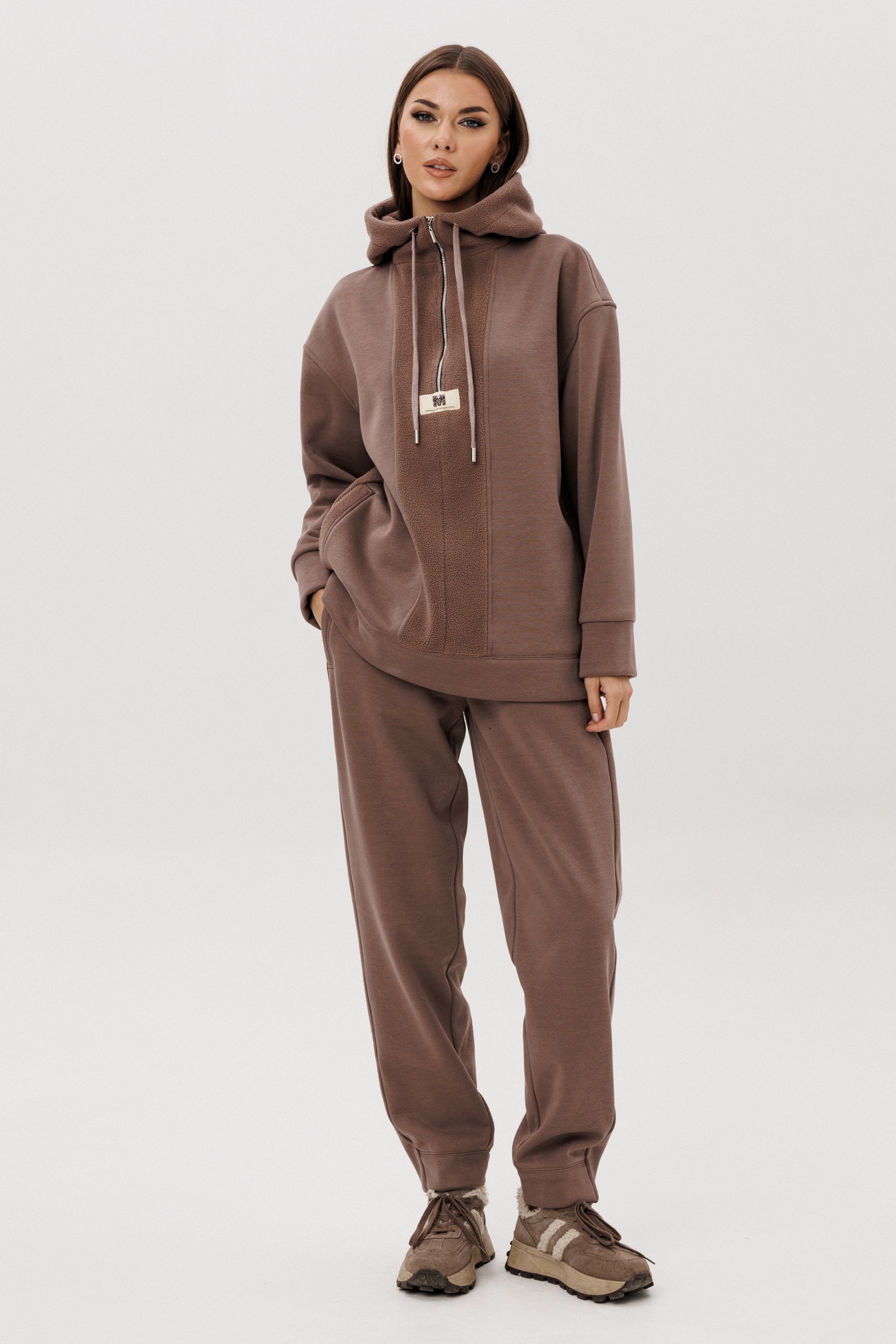 Уютный костюм из тёплого футера с мягким начёсом «барашек» — идеальный выбор для прохладного сезона. Толстовка свободного силуэта с объёмным капюшоном и функциональной молнией спереди создаёт стильный и комфортный образ. Акцентная отделка и фирменная нашивка добавляют современный штрих. Брюки прямого кроя с эластичным поясом и манжетами обеспечивают удобную посадку и свободу движений.