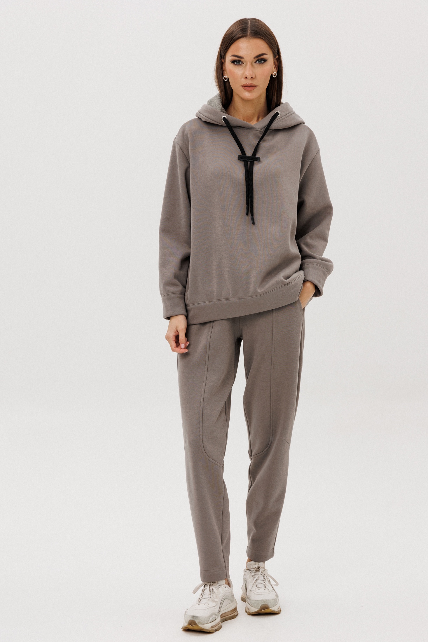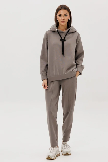 Уютный костюм из тёплого хлопчатобумажного футера с мягким начёсом «барашек» — идеальное сочетание комфорта и современного стиля. Объёмный худи с капюшоном и контрастным шнуром создаёт расслабленный силуэт, а брюки со слегка зауженным кроем и декоративными строчками добавляют образу актуальности.