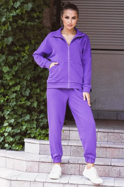 Стильный женский костюм спортивного стиля, свободного кроя, состоящий из брюк и джемпера. Манжеты рукавов, планка по низу изделия, воротник, пояс брюк выполнен из ткани-компаньена кошкорсе в цвет основной ткани. Джемпер с цельнокроенным рукавом, с застежкой -молнией по центру, с модельными треугольными резами на переде. Удобные карманы в нижней части полочки, вышивка- логотип на левом стороне в цвет ткани.