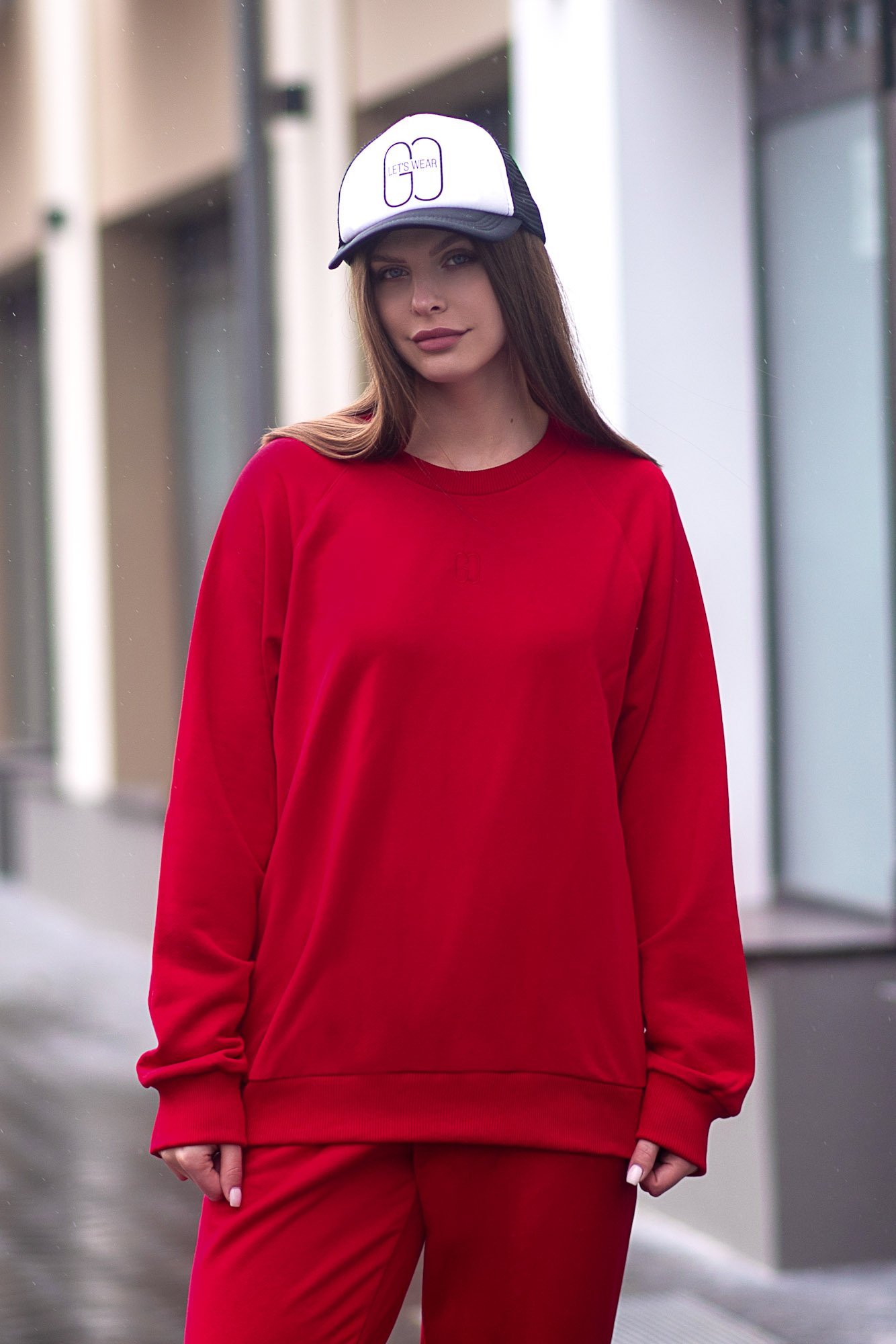 Костюм женский повседневный, спортивного стиля из комфортной ткани (футера), состоящий из свитшота и брюк. Свитшот свободного силуэта (слегка оверсайз), с рукавами покроя реглан с притачной манжетой по низу. Вышивка – логотип в левой части переда в цвет ткани. Рукава длинные с притачной манжетой по низу. Брюки с притачным поясом, резинкой и шнурком внутри. Передняя половинка брюк с боковыми карманами. По низу брюк – притачные манжеты.