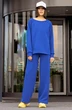 Костюм женский, повседневный, спортивного стиля из комфортной ткани, состоящий из свободного свитшота и прямых брюк. Свитшот с широкой горловиной, с длинными рукавами-реглан, внизу с манжетами. По центру переда - вышивка-логотип в цвет ткани. Брюки прямые длинные с карманами на передних половинках, внутри пояса резинка.