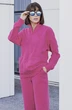 Стильный женский костюм спортивного стиля, свободного кроя, состоящий из брюк и джемпера. Манжеты рукавов, планка по низу изделия, воротник, пояс брюк выполнен из ткани-компаньена кошкорсе в цвет основной ткани. Джемпер с цельнокроенным рукавом, с застежкой -молнией по центру, с модельными треугольными резами на переде. Удобные карманы в нижней части полочки, вышивка- логотип на левом стороне в цвет ткани.