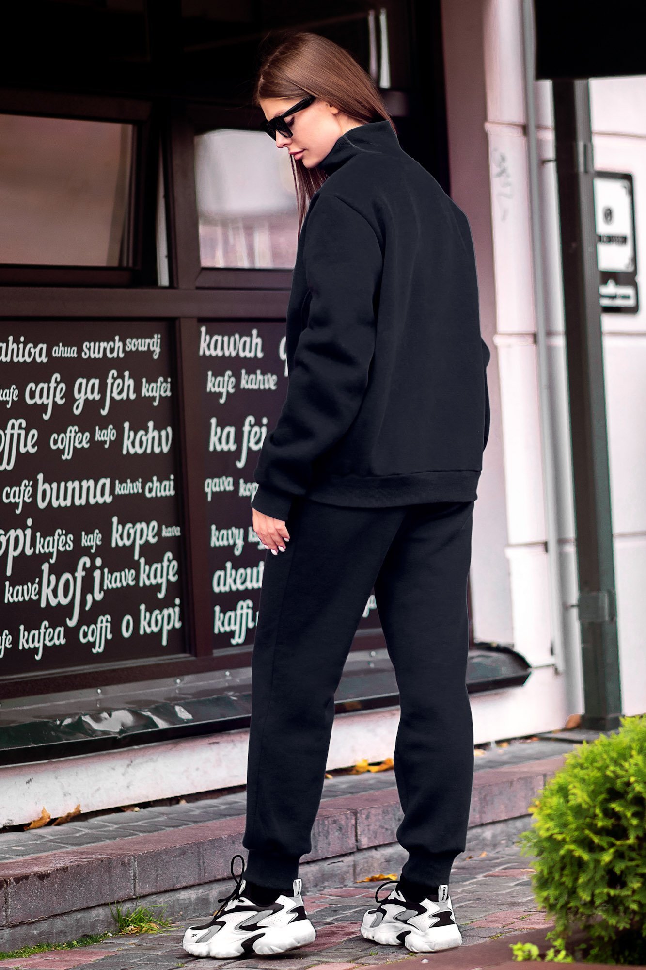 Манжеты рукавов, планка по низу изделия, стойка-воротник, пояс брюк, манжеты брюк выполнены из ткани-компаньена в цвет основной ткани. Джемпер с центральной застежкой-молнией контрастного цвета с дизайнерскими подрезами на переде и удобным карманом. На левом переде вышивка-логотип в цвет ткани. Брюки зауженные, с манжетой внизу, с поясом и внутри резинкой и шнуром для фиксации на талии. На передних половинках боковые удобные карманы.